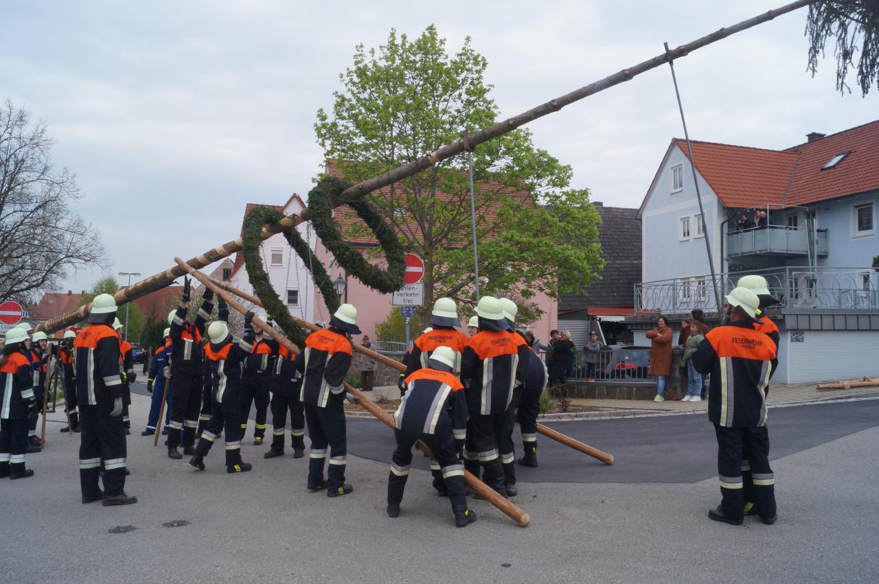 Da staunten die Kameradinnen und Kameraden der Feuerwehr nicht schlecht, als der Maibaumzug an der ehemaligen Sparkasse um die Kurve bog. Am und um das Kriegerdenkmal hatte sich eine Menge an Leuten versammelt, die wir so aus den Vorjahren nicht kannten. Offensichtlich war das große Publikum den Frauen und Männern ein zusätzlicher Ansporn, denn nach nur 30 Minuten stand der Baum fest in seiner Verankerung. Wir bedanken uns ganz herlich für die rege Teilnahme!