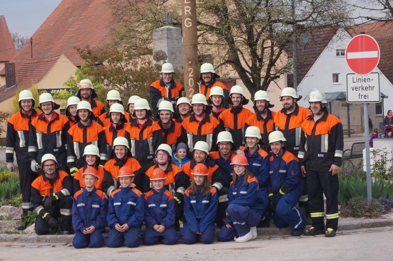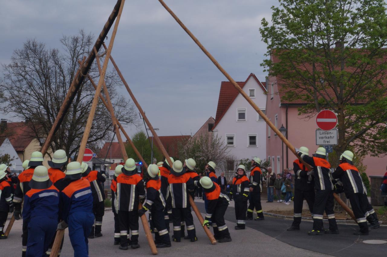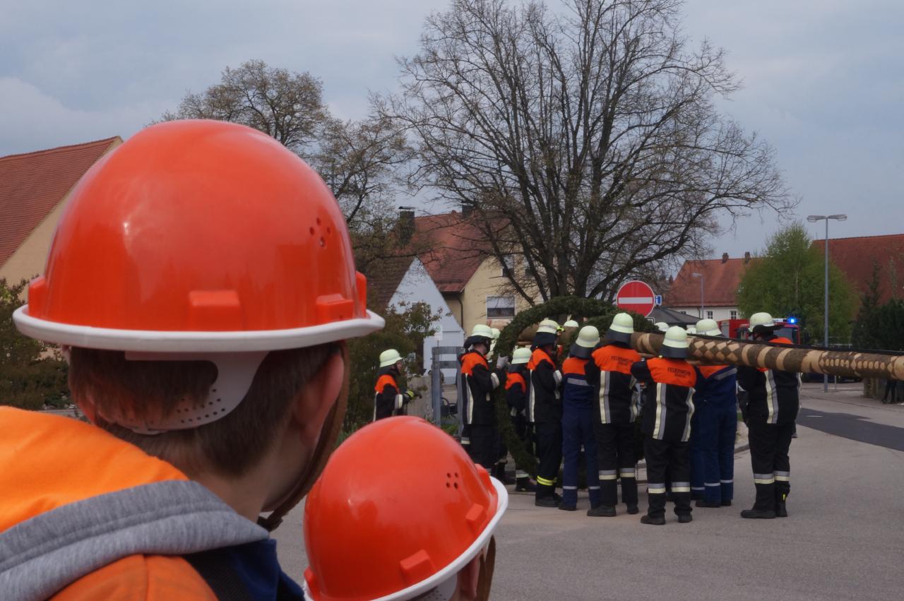 Da staunten die Kameradinnen und Kameraden der Feuerwehr nicht schlecht, als der Maibaumzug an der ehemaligen Sparkasse um die Kurve bog. Am und um das Kriegerdenkmal hatte sich eine Menge an Leuten versammelt, die wir so aus den Vorjahren nicht kannten. Offensichtlich war das große Publikum den Frauen und Männern ein zusätzlicher Ansporn, denn nach nur 30 Minuten stand der Baum fest in seiner Verankerung. Wir bedanken uns ganz herlich für die rege Teilnahme!