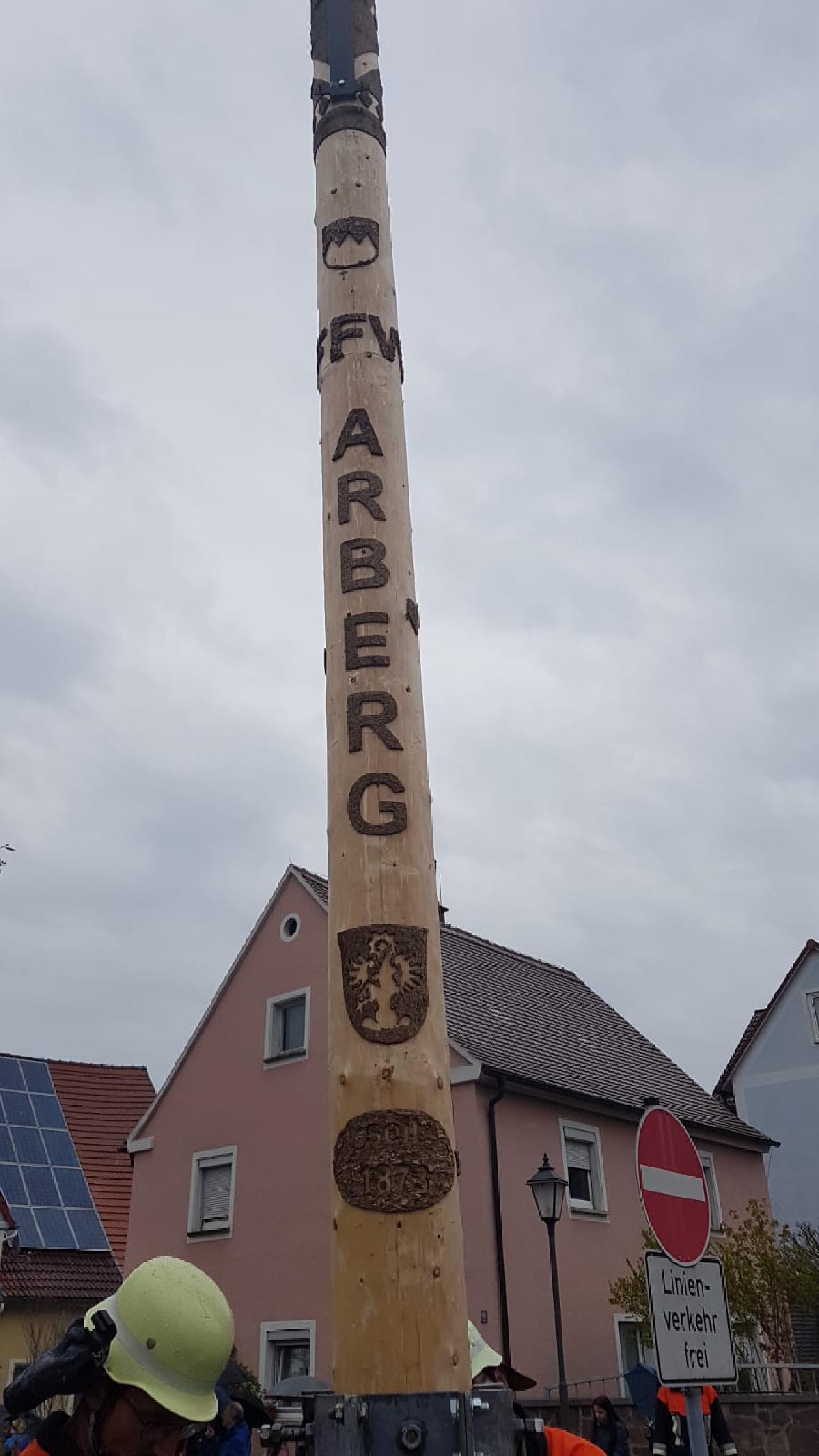 Pünktlich zum Abmarsch vom Feuerwehrhaus zum Kriegerdenkmal setzte der Regen ein. Dieser hielt - zu unserer großen Freude - die Arberger aber nicht davon ab, ihrer Feuerwehr beim Aufstellen des Maibaums zuzusehen. Unter den wachsamen Augen eines großen mit Regenschirmen bewehrten Publikums hievten die Feuerwehrleute den Baum unfallfrei in seine Verankerung - was mit einer Runde Applaus quittiert wurde.